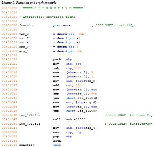 One of the most powerful aspects of IDA Pro is its ability to recognize functions, label them, and break down the local variables and parameters. Listing 5 shows an example of a function that has been recognized by IDA Pro. Notice how IDA Pro tells us that this is an EBP-based stack frame used in the function, which means the local variables and parameters will be referenced via the EBP register throughout the function. IDA Pro has successfully discovered all local variables and parameters in this function. It has labeled the local variables with the prefix var_ and parameters with the prefix arg_, and named the local variables and parameters with a suffix corresponding to their offset relative to EBP. IDA Pro will label only the local variables and parameters that are used in the code, and there is no way for you to know automatically if it has found everything from the original source code. Local variables will be at a negative offset relative to EBP and arguments will be at