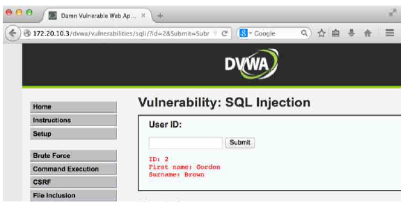 Web Application Address: http://172.20.10.3/dvwa/vulnerabilities/sqli/?id=2&Submit=Submit#.
